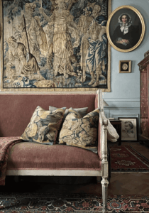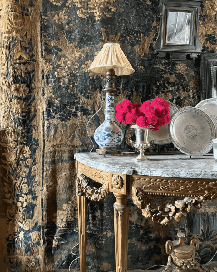 It fits surprisingly well with châteaucore, a trend that’s been around for a few years now and draws inspiration from the romance of French castles. Not sleek or perfect, but lived-in. Think weathered materials and furniture collected over generations. Gobelins belong right there, with their landscapes, hunting scenes, religious imagery or mythological figures.